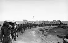On 13 June, the 21st Panzer Division attacked Rigel Ridge in the middle of a sandstorm.[56] The Germans overran part of the 2nd Scots Guards at the Knightsbridge Box at the west end of Rigel Ridge, overlooked by the 6th South African Anti-tank battery of the 2nd Field Regiment, Natal Field Artillery and a battery of the 11th (HAC) Regiment RHA nearby. The South African gunners kept firing until their guns were destroyed, allowing the withdrawal of other Allied formations.[57] The South African battery commander had decided to stay and maintain fire against the German tanks, to delay the Germans for as long as possible. The remaining guns were commanded individually and fired at the Panzers over open sights. The German tanks took up positions behind the ridge, with anti-tank guns placed between them. A column of Panzers attacked from the rear, surrounding them and cutting off all escape and the gunners kept firing until the eight guns had been destroyed. About half the gun detachments were killed and wounded, including the battery commander and many officers. The last gun in action was manned by Lieutenant Ashley and a signaller; when the battery had been silenced, the Axis tanks approached cautiously and the South African gunners were taken prisoner.[58]