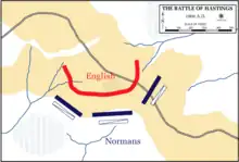 Harold's forces deployed in a small, dense formation at the top of a steep slope,[84] with their flanks protected by woods and marshy ground in front of them.[88] The line may have extended far enough to be anchored on a nearby stream.[89] The English formed a shield wall, with the front ranks holding their shields close together or even overlapping to provide protection from attack.[90] Sources differ on the exact site that the English fought on: some sources state the site of the abbey,[91][92][93] but some newer sources suggest it was Caldbec Hill.[89][84]