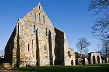 Battle Abbey was founded by William at the site of the battle. According to 12th-century sources, William made a vow to found the abbey, and the high altar of the church was placed at the site where Harold had died.[101] More likely, the foundation was imposed on William by papal legates in 1070.[135] The topography of the battlefield has been altered by subsequent construction work for the abbey, and the slope defended by the English is now much less steep than it was at the time of the battle; the top of the ridge has also been built up and levelled.[78] After the Dissolution of the Monasteries, the abbey's lands passed to secular landowners, who used it as a residence or country house.[136] In 1976 the estate was put up for sale and purchased by the government with the aid of some American donors who wished to honour the 200th anniversary of American independence.[137] The battlefield and abbey grounds are currently owned and administered by English Heritage and are open to the public.[138]