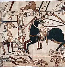 ![]() Harold Rex Interfectus Est: "King Harold is killed". Scene from the Bayeux Tapestry depicting the Battle of Hastings and the death of Harold. | |||||||