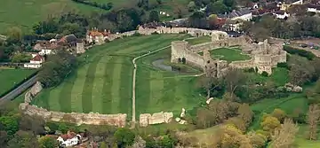 William mustered his forces at Saint-Valery-sur-Somme, and was ready to cross the English Channel by about 12 August.[36] But the crossing was delayed, either because of unfavourable weather or to avoid being intercepted by the powerful English fleet. The Normans crossed to England a few days after Harold's victory over the Norwegians, following the dispersal of Harold's naval force, and landed at Pevensey in Sussex on 28 September.[30][lower-alpha 7][lower-alpha 8] A few ships were blown off course and landed at Romney, where the Normans fought the local fyrd.[32] After landing, William's forces built a wooden castle at Hastings, from which they raided the surrounding area.[30] More fortifications were erected at Pevensey.[51]