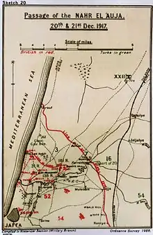 The advance by two infantry and one mounted division into the Judean Hills towards Jerusalem was suspended in the area of Nebi Samwil on 24 November. On the same day infantry from the 54th (East Anglian) Division and the Anzac Mounted Division began their attack across the Nahr el Auja on the Mediterranean coast to the north of Jaffa.[57][59] The only mounted brigade available was the New Zealand Mounted Rifles Brigade, which had been on garrison duty in the occupied city of Jaffa since 16 November.[62] On the northern bank the river was defended by the 3rd and 7th Divisions of the Ottoman Eighth Army.[29]