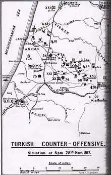 During the week beginning 27 November the Ottoman Army launched a series of infantry attacks employing shock tactics in the hope of breaking the British lines during the period of destabilisation created by troop reinforcements and withdrawals.[75] Counterattacks were launched by the Ottoman 16th and 19th Divisions in the Judean Hills on Nebi Samweil and on the Zeitun plateau. Attacks were also launched against British lines of communication via a gap between the British forces on the maritime plain and those in the Judean Hills and also against several British units spread out on the maritime plain.[76]