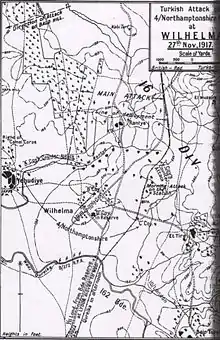At 17:00 on 27 November the Ottoman Eighth Army's 16th Division launched a counterattack at Wilhelma on the maritime plain. They reached to within 400 yd (370 m) of infantry in the 4th Battalion, Northamptonshire Regiment, which was deployed in and around Wilhelma. They also advanced against the 10th Battalion, London Regiment, south-east at Deir Tuweif, against the 5th Battalion, Bedfordshire Regiment, at Beit Nebala, and against the Imperial Camel Corps Brigade at Bald Hill.[77][78] At Wilhelma, the Ottoman force prepared to make a bayonet attack, but machine gun and Lewis gun fire with 272nd Brigade Royal Field Artillery held them off.[Note 6] The British successfully counterattacked on both flanks, forcing the Ottoman troops to withdraw to Rantye.[77] On the left of the Imperial Camel Corps Brigade south west of Bald Hill, units of the Ottoman 16th Division renewed the attack during the night of 28 November. They drove in the right outposts of the 2nd Light Horse Brigade's front line and entrenched themselves in this forward position. But at dawn on 29 November the Ottoman soldiers found themselves in an untenable position—overlooked by one Australian post and enfiladed by others on either flank. Unable to advance or retreat, three officers and 147 troops with four machine guns surrendered to the 7th Light Horse Regiment.[79]