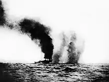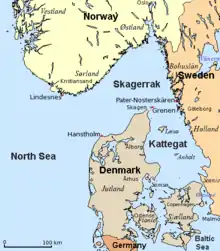 The Battle of Jutland (German: Skagerrakschlacht, the Battle of the Skagerrak) was a naval battle fought between Britain's Royal Navy Grand Fleet, under Admiral Sir John Jellicoe, and the Imperial German Navy's High Seas Fleet, under Vice-Admiral Reinhard Scheer, during the First World War. The battle unfolded in extensive manoeuvring and three main engagements (the battlecruiser action, the fleet action, and the night action), from 31 May to 1 June 1916, off the North Sea coast of Denmark's Jutland Peninsula.[2] It was the largest naval battle and the only full-scale clash of battleships of the war. Jutland was the third fleet action between steel battleships, following the Battle of the Yellow Sea in 1904[3][4] and the Battle of Tsushima in 1905,[5] during the Russo-Japanese War. Jutland was the last major battle in history fought primarily by battleships.[6]