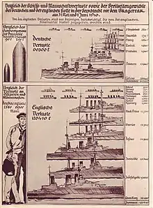 Admiral John Fisher, responsible for reconstruction of the British fleet in the pre-war period, favoured large guns, oil fuel, and speed. Admiral Tirpitz, responsible for the German fleet, favoured ship survivability and chose to sacrifice some gun size for improved armour. The German battlecruiser SMS Derfflinger had belt armour equivalent in thickness—though not as comprehensive—to the British battleship HMS Iron Duke, significantly better than on the British battlecruisers such as Tiger. German ships had better internal subdivision and had fewer doors and other weak points in their bulkheads, but with the disadvantage that space for crew was greatly reduced.[27] As they were designed only for sorties in the North Sea they did not need to be as habitable as the British vessels and their crews could live in barracks ashore when in harbour.[28]