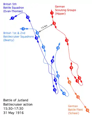 Unfortunately for Beatty, his initial course changes at 14:32 were not received by Sir Hugh Evan-Thomas's 5th Battle Squadron (the distance being too great to read his flags), because the battlecruiser HMS Tiger—the last ship in his column—was no longer in a position where she could relay signals by searchlight to Evan-Thomas, as she had previously been ordered to do. Whereas before the north turn, Tiger had been the closest ship to Evan-Thomas, she was now further away than Beatty in Lion. Matters were aggravated because Evan-Thomas had not been briefed regarding standing orders within Beatty's squadron, as his squadron normally operated with the Grand Fleet. Fleet ships were expected to obey movement orders precisely and not deviate from them. Beatty's standing instructions expected his officers to use their initiative and keep station with the flagship.[45] As a result, the four Queen Elizabeth-class battleships—which were the fastest and most heavily armed in the world at that time—remained on the previous course for several minutes, ending up 10 mi (8.7 nmi; 16 km) behind rather than five.[46] Beatty also had the opportunity during the previous hours to concentrate his forces, and no reason not to do so, whereas he steamed ahead at full speed, faster than the battleships could manage. Dividing the force had serious consequences for the British, costing them what would have been an overwhelming advantage in ships and firepower during the first half-hour of the coming battle.[44]