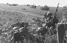 Nearly all artillery, including howitzers, guns, anti-aircraft and rockets, were tasked with anti-tank defence.[134] Dug-in tanks and self-propelled guns further strengthened the anti-tank defences.[126][134] Anti-tank forces were incorporated into every level of command, mostly as anti-tank strong points with the majority concentrated on likely attack routes and the remainder amply spread out elsewhere.[134] Each anti-tank strong-point typically consisted of four to six anti-tank guns, six to nine anti-tank rifles, and five to seven heavy and light machine guns. They were supported by mobile obstacle detachments as well as by infantry with automatic firearms.[135] Independent tank and self-propelled gun brigades and regiments were tasked with cooperating with the infantry during counterattacks.[135]
