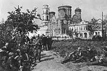 Special training was provided to the Soviet infantry manning the defences to help them overcome the tank phobia that had been evident since the start of the German invasion.[140][141] Soldiers were packed into trenches and tanks were driven overhead until all signs of fear were gone.[lower-alpha 18][141] This training exercise was referred to by the soldiers as "ironing".[128] In combat, the soldiers would spring up in the midst of the attacking infantry to separate them from the spearheading armoured vehicles. The separated armoured vehicles – now vulnerable to infantry armed with anti-tank rifles, demolition charges and molotov cocktails – could then be disabled or destroyed at point-blank range.[142] These types of attacks were mostly effective against the Ferdinand tank destroyers, which lacked machine guns as secondary armament.[142] The soldiers were also promised financial rewards for each tank destroyed, with the People's Commisariat of Defence providing a bounty of 1,000 roubles for each destroyed tank.[143]