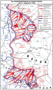 ![]() German penetration during the attack on the Kursk salient and Soviet counter-offensive in the northern sector | |||||||||