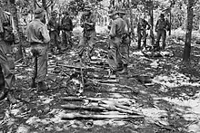 In support was an artillery battalion equipped with 75 mm recoilless rifles (RCLs), 82 mm mortars, and 12.7 mm heavy machine-guns, an engineer battalion, a signals battalion and a sapper reconnaissance battalion, as well as medical and logistic units.[17] Local forces included D445 Battalion, which normally operated in the south and in Long Khánh. Under command of Bui Quang Chanh (alias Sau Chanh), it consisted of three rifle companies—C1, C2, C3—and a weapons company, C4; a strength of 550 men.[18][Note 1] Recruited locally and operating in familiar terrain, they possessed an intimate knowledge of the area.[22] Guerrilla forces numbered 400 men operating in groups of five to 60, with two companies in Châu Đốc district, one in Long Dat, and a platoon in Xuyên Mộc. In total, VC strength was estimated to have been around 4,500 men.[12][23]