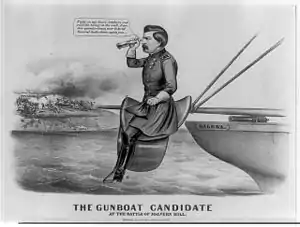 In McClellan's case, his success on Malvern Hill was overshadowed by his overall defeat in the Seven Days Battles. The Northern public met McClellan's defeat with despondency, and his reputation was tarnished. Some of McClellan's soldiers voiced their continued confidence in him. Such opinions were not unanimous, however; one of McClellan's engineers, Lt. William Folwell, wondered why "they deify a General whose greatest feat has been a masterly retreat."[107] A similar opinion was shared by many others in the rank and file of the Union military.[108] Some in politics also abandoned the Democratic McClellan. He was also accused of being on the Galena during the Battle of Malvern Hill, and newspapers and tabloids around the country heaped scorn on him for this, especially when he ran for president in 1864.[109] President Lincoln was also losing faith in McClellan.[110] On June 26, the day of Lee's first offensive during the Seven Days, the Army of Virginia was formed and the command given to Maj. Gen. John Pope. While McClellan was at Harrison's Landing, parts of his Army of the Potomac were continuously reassigned to Pope. Pope and his Army of Virginia left for Gordonsville, Virginia on July 14, setting the stage for the subsequent Northern Virginia Campaign.[111]
