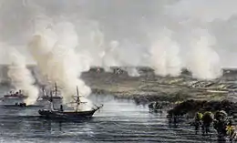 The firefight also alerted the three Union boats on the James—the ironclad USS Galena, and the gunboats USS Jacob Bell and USS Aroostook[lower-alpha 6]—which began lobbing missiles twenty inches (510 mm) in length and eight inches (200 mm) in diameter from their position on the James River onto the battlefield.[59] The explosions and impacts of the gunboat fire impressed the Confederate troops, but the guns' aim was unreliable, and the large shells did considerably less damage than might have been expected.[60]