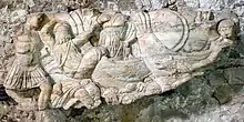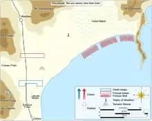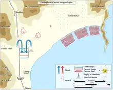 For approximately five days the armies therefore confronted each other across the plain of Marathon in stalemate.[35] The flanks of the Athenian camp were protected by either a grove of trees or an abbatis of stakes (depending on the exact reading).[38][39] Since every day brought the arrival of the Spartans closer, the delay worked in favor of the Athenians.[35] There were ten Athenian strategoi (generals) at Marathon, elected by each of the ten tribes that the Athenians were divided into; Miltiades was one of these.[40] In addition, in overall charge, was the War-Archon (polemarch), Callimachus, who had been elected by the whole citizen body.[41] Herodotus suggests that command rotated between the strategoi, each taking in turn a day to command the army.[42] He further suggests that each strategos, on his day in command, instead deferred to Miltiades.[42] In Herodotus's account, Miltiades is keen to attack the Persians (despite knowing that the Spartans are coming to aid the Athenians), but strangely, chooses to wait until his actual day of command to attack.[42] This passage is undoubtedly problematic; the Athenians had little to gain by attacking before the Spartans arrived,[43] and there is no real evidence of this rotating generalship.[44] There does, however, seem to have been a delay between the Athenian arrival at Marathon and the battle; Herodotus, who evidently believed that Miltiades was eager to attack, may have made a mistake while seeking to explain this delay.[44]