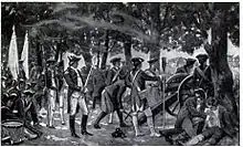 As the British force moved towards the larger tank, it was observed that the left arm of the Nawab's army had lingered behind the rest. When the rear of this division reached a point in a line with the northern point of the grove, it turned left and marched towards the grove. Clive, unaware that it was Mir Jafar's division, supposed that his baggage and stores were the intended target and sent three platoons under Captain Grant and Lieutenant Rumbold and a field piece under John Johnstone, a volunteer, to check their advance. The fire of the field piece halted the advance of the division, which remained isolated from the rest of the Nawab's army.[105][106][107]