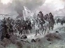 The initial clash favoured the Dutch and Danish squadrons. The disparity of numbers – exacerbated by Villeroi stripping their ranks of infantry to reinforce his left flank – enabled Overkirk's cavalry to throw the first line of French horse back in some disorder towards their second-line squadrons. This line also came under severe pressure and, in turn, was forced back to their third-line of cavalry and the few battalions still remaining on the plain.[60] But these French horsemen were amongst the best in Louis XIV's army – the Maison du Roi,[61] supported by four elite squadrons of Bavarian Cuirassiers. Ably led by de Guiscard, the French cavalry rallied, thrusting back the Allied squadrons in successful local counterattacks.[62] On Overkirk's right flank, close to Ramillies, ten of his squadrons suddenly broke ranks and were scattered, riding headlong to the rear to recover their order, leaving the left flank of the Allied assault on Ramillies dangerously exposed. Notwithstanding the lack of infantry support, de Guiscard threw his cavalry forward in an attempt to split the Allied army in two.