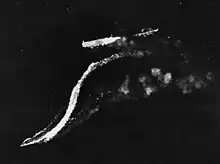 ![]() USS Enterprise maneuvering radically under aerial attack and afire on 24 August 1942. Anti-aircraft shell bursts are visible above the carrier. | |||||||