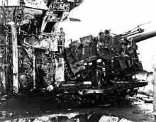Just 30 seconds later, the next D3A dive bomber, piloted by Petty Officer Tamotsu Akimoto, planted its 242-kilogram (534 lb) high-explosive "land" bomb only 15 feet (4.6 m) away from where the first bomb hit. The resulting detonation ignited a large secondary explosion from one of the nearby 5-inch (127 mm) guns' ready powder casings, killing 35 members of the nearby gun crews and starting a large fire.[45]