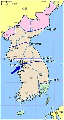 On September 15, exhausted KPA troops were caught unaware by the landings at Inchon, far behind their lines. Those forces that remained after 15 days of fighting were forced to retreat in a total rout or risk being completely cut off.[162] Isolated KPA resistance continued until September 18, but on that date UN troops were mounting a full-scale breakout offensive and pursuing retreating KPA units to the north, ending the fighting around the Pusan Perimeter.[163]