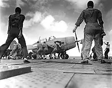 Starting at 09:30, Enterprise landed many of the damaged and fuel-depleted CAP fighters and returning scout aircraft from both carriers. However, with her flight deck full, and the second wave of incoming Japanese aircraft detected on radar at 09:30, Enterprise ceased landing operations at 10:00. Fuel-depleted aircraft then began ditching in the ocean, and the carrier's escorting destroyers rescued the aircrews. One of the ditching aircraft, a damaged TBF from Enterprise's strike force that had been attacked earlier by Zeros from Zuihō, crashed into the water near the destroyer USS Porter. As Porter rescued the TBF's aircrew, she was struck by a torpedo, possibly from the ditched aircraft, causing heavy damage and killing 15 crewmen.[52] After the task force commander ordered the destroyer scuttled, the crew was rescued by the destroyer USS Shaw which then sank Porter with gunfire (08°32′S 167°17′E).[53]