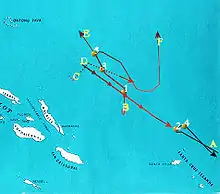 After the Battle of the Eastern Solomons on 24–25 August, in which the fleet carrier USS Enterprise was heavily damaged and forced to sail to Pearl Harbor, Hawaii, for a month of major repairs, three U.S. carrier task forces remained in the South Pacific area. The task forces were based around the fleet carriers USS Wasp, Saratoga, and Hornet plus their respective air groups and supporting surface warships, including battleships, cruisers, and destroyers, and were primarily stationed between the Solomons and New Hebrides (Vanuatu) islands. In this area of operations, the carriers were charged with guarding the line of communication between the major Allied bases at New Caledonia and Espiritu Santo, supporting the Allied ground forces at Guadalcanal and Tulagi against any Japanese counteroffensives, covering the movement of supply ships to Guadalcanal, and engaging and destroying any Japanese warships, especially carriers, that came within range.[7] The area of ocean in which the U.S. carrier task forces operated was known as "Torpedo Junction"[8] by U.S. forces because of the high concentration of Japanese submarines in the area.[9]