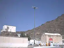 The reinforcements camped near Badr, behind a hill not visible from Muhammad's position.[31] After the caravan had escaped, some of them withdrew, but others remained.[32] Muhammad became aware of their presence after he captured their water carrier who was carrying water from the wells of Badr.[33] Muhammad ordered his followers to close all the wells with sand except one for him and the Muslims,[34] forcing the Quraysh to fight over the water and leading to the Quraysh's defeat.[35]