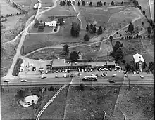 In the post-Civil War era, a businessman named Samuel Tate constructed a hotel west of Bean Station that became the main focus of a resort known as Tate Springs.[24] Around the late 1870s, the property was purchased by Captain Thomas Tomlinson, a Union army veteran who served in the Battle of Bean's Station, would take up an interest in the Bean Station community, and transformed the property into a vast resort, focused on a large Victorian-style luxury hotel, that advertised the supposed healing powers of its mineral spring’s water.[25] During its heyday, the resort complex included over three-dozen buildings, a 100-acre (40 ha) park, and an 18-hole golf course.[26] The resort had attracted some of the wealthiest people in America during this time.[24] The resort declined during the Great Depression and closed in 1941.[27] In 1943, the hotel site would be redeveloped into a school and orphanage known as Kingswood. The main hotel structure was destroyed by fire in 1963, and the only remnants of the complex are the cabins of the site, the pool bathhouse, and the springhouse, the last of which was listed on the National Register of Historic Places in 1973.[27] The Tate Springs site still runs as the Kingswood orphanage as of 2021.[27]