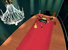 First rendered as a simple cube,[27] the filmmakers used computers to design the ballroom as a production set, making it the first full-dimensional computer-generated colored background in history.[27] Unlike Disney's previous CGI ventures, Beauty and the Beast's ballroom was a much more detailed task that required animators to work exclusively with computers to compose, animate and color the scene.[51][52] According to Hillin, the revolutionary use of computers allowed for a combination of theatrical lighting and "sweeping" perspectives, which ultimately introduced live-action techniques to animation.[38] To make the scene a "special moment" for the characters,[53] a "virtual camera" was used to allow the animators to create the illusion of tracking, panning and zooming[52] that "establish[es] the mood" while helping audiences experience what the characters themselves are experiencing.[38] Imitating tracking shots, the camera frequently soars and zooms around the couple.[54] The camera first follows Belle and the Beast as they enter the ballroom before panning until it finally returns to focus on the two characters.[55] In his book Basics Animation 02: Digital Animation, author Andrew Chong wrote that "The sweeping camera move with a constantly shifting perspective during the ballroom sequence was a composition of traditionally drawn elements for the characters with digitally animated scenery".[56] Several computer animators, layout artists, art directors and background artists used their combined efforts to achieve the scene's end results; the ballroom's official dimensions read 72 feet high, 184 feet long and 126 feet wide.[57] The space also houses 28 windows and a dome that measures 86 by 61 feet; the dome's mural was first hand-painted before it was texture-mapped onto it using a computer.[57] Each element was carefully constructed individually.[57] Timothy Wegner described the finished product in his book Image Lab as a "huge and elegant" ballroom in which "the walls are decorated with elaborate moldings, Corinthian columns, and hundreds of candles".[58]