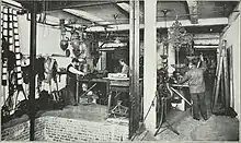 The interior color scheme was devised largely by Wilfred Buckland, who worked for Belasco's studios.[13][14][19] Everett Shinn designed murals for the theater.[19][20] The Belasco was outfitted with the most advanced stagecraft tools available including extensive lighting rigs, a hydraulics system, and vast wing and fly space. Like the neighboring Lyceum Theatre, it was built with ample workshop space underneath the stage.[21] Tiffany Studio designed lighting fixtures throughout the theater,[22] which were executed by theatrical-lighting specialists Nimis & Nimis.[22][23] Nineteen emergency exits lead from the auditorium onto the street or the alley, including ten from orchestra level. According to news reports published when the theater opened, the entire theater could be evacuated in three minutes.[9][11][24]