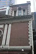 The upper stories are asymmetrical.[6] The office section of the theater is at the extreme western end of the facade, while a pair of pavilions flanks three vertical bays on the rest of the facade. The entire third story is topped by an entablature with a molded frieze, a set of dentils, and a heavy cornice with modillions. The cornice wraps around to the side elevations of the facade.[18]