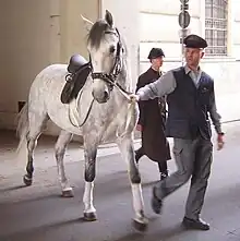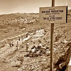 Pre-production began at Cinecittà Studios around October 1957.[20] The MGM Art Department produced more than 15,000 sketches and drawings of costumes, sets, props, and other items needed for the film (8,000 alone for the costumes); photostatted each item; and cross-referenced and catalogued them for use by the production design team and fabricators.[89] More than a million props were ultimately manufactured.[90] Construction of miniatures for the entrance of Quintus Arrius into Rome and for the sea battle were under way by the end of November 1957.[91] MGM location scouts arrived in Rome to identify shooting locations in August 1957.[92] Location shooting in Africa was actively under consideration, and in mid-January 1958, MGM said that filming in North Africa (later revealed to be Libya) would begin on March 1, 1958, and that 200 camels and 2,500 horses had already been procured for the studio's use there.[93] The production was then scheduled to move to Rome on April 1, where Andrew Marton had been hired as second unit director and 72 horses were being trained for the chariot race sequence.[93] However, the Libyan government canceled the production's film permit for religious reasons on March 11, 1958, just a week before filming was to have begun.[lower-alpha 13][94][95] It is unclear whether any second unit filming took place in Israel. A June 8, 1958, report in The New York Times said second unit director Andrew Marton had roamed "up and down the countryside" filming footage.[96] However, the American Film Institute claims the filming permit was revoked in Israel for religious reasons as well (although when is not clear), and no footage from the planned location shooting near Jerusalem appeared in the film.[91]