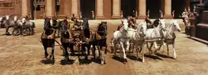 The chariot race in Ben-Hur was directed by Andrew Marton and Yakima Canutt,[123] filmmakers who often acted as second unit directors on other people's films. Each man had an assistant director, who shot additional footage.[124] Among these were Sergio Leone,[125] who was senior assistant director in the second unit and responsible for retakes.[126] William Wyler shot the "pageantry" sequence that occurs before the race, scenes of the jubilant crowd, and the victory scenes after the race concludes.[127] The "pageantry" sequence before the race begins is a shot-by-shot remake of the same sequence from the 1925 silent film version.[128] Knowing that the chariot race would be primarily composed of close-up and medium shots, Wyler added the parade in formation (even though it was not historically accurate) to impress the audience with the grandeur of the arena.[58]