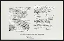 André conferred with Clinton, who gave him broad authority to pursue Arnold's offer. André then drafted instructions to Stansbury and Arnold.[70] This initial letter opened a discussion on the types of assistance and intelligence that Arnold might provide, and included instructions for how to communicate in the future. Letters were to be passed through the women's circle that Peggy Arnold was a part of, but only Peggy would be aware that some letters contained instructions that were to be passed on to André, written in both code and invisible ink, using Stansbury as the courier.[71]