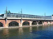 In October 1994 a large-scale modernisation programme was started on the Stadtbahn. The viaducts were checked and strengthened, and the tracks were bedded in concrete to improve durability and comfort. Almost all stations saw large financial investments and were thoroughly modernised. Long-distance traffic between Zoo and Ostbahnhof stations was interrupted during the construction period and the S-Bahn trains temporarily used the long-distance line. On 24 March 1998 the Stadtbahn was reopened, now carrying up to three ICE and IC lines as well as five RegionalExpress lines.[14] Part of the Stadtbahn was realigned as part of the construction of the new Berlin Hauptbahnhof, with construction commencing in 2001 and completed in July 2002. The realigned section consisted of two 450 m-long bridges spanning the station and the adjacent Humboldthafen port.