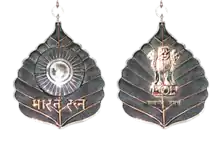 A year later, the design was modified. The current medal is in the shape of a peepal leaf, approximately 2+5⁄16 inches (59 mm) long, 1+7⁄8 inches (48 mm) wide and 1⁄8 inch (3.2 mm) thick and rimmed in platinum. The embossed sun burst design, made of platinum, on the obverse side of the medal has a diameter of 5⁄8 inch (16 mm) with rays spreading out from 5⁄6 inch (21 mm) to 1⁄2 inch (13 mm) from the center of the Sun. The words "Bharat Ratna" on the obverse side remained the same as the 1954 design as did the emblem of India and "Satyameva Jayate" on the reverse side. A 2-inch-wide (51 mm) white ribbon is attached to the medal so it can be worn around the neck.[3][11][21] In 1957, the silver-gilt decoration was changed to burnished bronze.[2][22] The Bharat Ratna medals are produced at Alipore Mint, Kolkata along with the other civilian and military awards like Padma Vibushan, Padma Bhushan, Padma Shri, and Param Veer Chakra.[23]