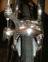 The caliper brake is a class of cable-actuated brake in which the brake mounts to a single point above the wheel, theoretically allowing the arms to auto-centre on the rim. Arms extend around the tyre and end in brake shoes that press against the rim. While some designs incorporate dual pivot points — the arms pivot on a sub-frame — the entire assembly still mounts to a single point.