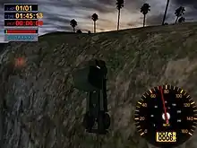 There is no time limit to complete a race, and the opponent does not move.[lower-alpha 1] The player's truck can pass through the opponent and all objects placed on the route due to a lack of collision detection. Off-roading bears no traction penalty, hills can be ascended and descended without affecting the truck's speed, and traversal is possible in the emptiness outside the game map. Completing a race rewards the player with a trophy bearing the phrase "You're winner !" [sic].[2][4]