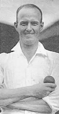 O'Reilly was the leading Australian bowler of the tour, taking 28 Test wickets at an average of less than 25, while Grimmett took 25 wickets at just under 27 runs apiece. Australia's other Test bowlers took only 18 wickets between them. On the tour as a whole, O'Reilly headed the tourists' averages, with 109 wickets at 17.04, which meant that he also topped the averages for the whole English cricket season.[75] In the matches against the English counties, he took 11 wickets in each of the games against Leicestershire and Glamorgan, and in the match against Somerset, after Hans Ebeling took the first wicket, he took the remaining nine for 38 runs, and that proved to be the best innings figures of his career.[76] He was named as one of the Wisden Cricketers of the Year in 1935 for his deeds on tour.[1]