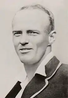 O'Reilly won a scholarship to the Sydney Teachers College at Sydney University, to train as a schoolmaster. However, the financial assistance was only for two years and merely sufficient for O'Reilly's rent at Glebe Point.[25] When he was in Sydney, O'Reilly received an invitation to join an athletics club based on his performances in Goulburn, but was only able to join after the secretary Dick Corish waived his membership fee.[26] Jumping 47 feet, he came second in a triple jump competition behind Nick Winter, who went on to win gold in the event at the 1924 Summer Olympics with a world record of 50 ft. O'Reilly also placed second in a high jumping competition, clearing six feet.[26][27] Corish was also a cricket administrator and invited O'Reilly to play in a David Jones Second XI. Not knowing anything of his new recruit's abilities, Corish did not allow O'Reilly to bowl until he explicitly complained of only being allowed to field.[26] O'Reilly promptly finished off the opposition's innings by removing the middle and lower order.[26] After an encounter with journalist Johnny Moyes, who wrote glowingly about O'Reilly's skills.[13]