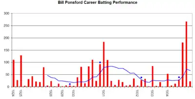 In 1919, Ponsford was selected for Victoria's baseball team, alongside future Test cricket teammate Jack Ryder. In 1923, The Sporting Globe claimed that Ponsford was "... the best batter of the season. ... Indeed, as an all-round man, it is doubtful if he has a superior in the state."[106] In 1925, Ponsford captained the Victorian team and was selected as centre fielder in an Australian representative team that played three matches against an outfit from the United States Pacific Fleet, which had docked in Melbourne. Over the three matches, won by the Australians, Ponsford made five safe hits, gained eight bases and his batting average was .357.[107] Ponsford's next match against American opposition was against a team from Stanford University that visited Australia in 1927. Ponsford's Victorian team defeated Stanford 5–3; it was the visitors' only loss on the tour.[108]