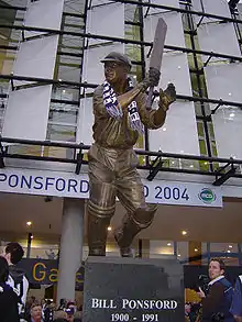 In 1986 the Western Stand of the Melbourne Cricket Ground was renamed the "W.H. Ponsford Stand". Ponsford was described by his son as being "tickled pink" by the honour, but that he would only agree to the renaming if he was not required to participate in any public appearance or media interview.[124] As part of the ongoing modernisation of the MCG the W.H. Ponsford Stand was torn down; the new stand was completed in 2004 and again named in his honour.[125] A statue of the cricketer was installed outside the W.H. Ponsford Stand in 1995—one of a series in place around the stadium commemorating Australia's sporting heroes.[126]