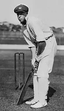 Fingleton wrote, "He crouched a little at the crease ... he tapped the ground impatiently with his bat while awaiting the ball, and his feet were so eager to be on the move that they began an impulsive move forward just before the ball was bowled. This was the shuffle that sometimes took him across the pitch against a fast bowler; but, that aside, his footwork was perfection. I never saw a better forcer of the ball to the on-side, and for this stroke his body moved beautifully into position."[131] However, Ponsford was not a stylish batsman. Bradman said "There were more beautiful players, but for absolute efficiency and results where can one turn to equal [Ponsford]?"[132] Robinson described Ponsford as the "founder of total batting, the first to make a habit of regarding 100 as merely the opening battle in a campaign for a larger triumph."[133] The New South Wales and Australian bowler Arthur Mailey later said that "I don't think it was the rungetting Ponny enjoyed so much as the bowlers' discomfort, especially when those bowlers came from New South Wales."[134]