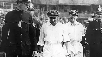 In a response to the record-breaking feats of Don Bradman, the English team that toured Australia in 1932–33—led by Douglas Jardine—adopted a tactic of fast, short pitched bowling directed at the body, later known as Bodyline.[66] While Bodyline sought to curb Bradman, it was used against all the Australian batsmen, including Ponsford. After being bowled twice behind his legs—by Larwood for 32 in the first innings and for two in the second innings by Bill Voce—in the first Test at Sydney, Ponsford was omitted from the team for the second Test at Melbourne.[67][68] Ponsford returned for the third Test in Adelaide, batting down the order.[69] The Test was controversial and highly acrimonious; several Australian batsmen—including Woodfull and Bert Oldfield—were hit on the body and head from the English fast bowling.[70] Ponsford was hit on several occasions during his innings of 85; he chose to turn his torso and take the rising balls on his body—especially on his left shoulder blade and backside—rather than risk a catch to the leg side fielders.[71] When Ponsford returned to the dressing room after his dismissal, his teammates were amazed by the mass of bruises that covered his back and shoulders.[72] Ponsford remarked to Bill O'Reilly, "I wouldn't mind having a couple more if I could get a hundred."[73]