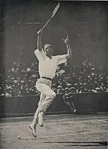From 1914 to 1917, Tilden won the Philadelphia championship.[9] Prior to 1920, he had won a number of Canadian doubles titles, but at the U.S. National Championships in 1918 and 1919 he lost the singles final to Robert Lindley Murray and "Little Bill" Johnston, respectively in straight sets. He won six consecutive U.S. singles championships from 1920 to 1925 and seven in total, making him the co-record holder with Richard Sears and Bill Larned.[10][11] In the winter of 1919–1920, he moved to Rhode Island, where, on an indoor court, he devoted himself to remodeling his relatively ineffective backhand into a much more effective one. With this change, he became the world No. 1 tennis player and the first male American to win the Wimbledon singles championship. In the mid-1920s, Tilden came into conflict with the USLTA regarding alleged violations of the amateur rule, specifically relating to the monetary compensation he received for writing tennis articles.[12]