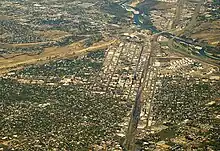The nearby town of Coulson appeared a far more likely site. Coulson was a rough-and-tumble town where arguments were often followed by gunplay. Liver-Eating Johnson was a lawman in Coulson.[35] Perhaps the most famous person to be buried in Coulson's Boothill cemetery is H.M. "Muggins" Taylor,[36] the scout who carried the news of Custer's Last Stand at the Battle of Little Bighorn to the world. Most buried here were said to have died with their boots on. The town of Coulson had been on the Yellowstone River, which made it ideal for the commerce steamboats brought up the river. However, when the Montana & Minnesota Land Company oversaw the development of potential railroad land, they ignored Coulson, and platted the new town of Billings just a couple of miles to the northwest. Coulson quickly faded away; most of her residents were absorbed into Billings. Yet, for a short time, the two towns coexisted; a trolley even ran between them. But ultimately there was no future for Coulson as Billings grew. Though it stood on the banks of the Yellowstone River only a couple of miles from the heart of present-day downtown Billings, the city of Billings never built on the land where Coulson once stood. Today Coulson Park sits along the banks of the Yellowstone where the valley's first town once stood.[30]