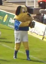 Birmingham's supporters are generally referred to as "Bluenoses" in the media and by the fans themselves; the name is also used in a derogatory manner by fans of other clubs.[117][118] A piece of public sculpture in the form of a ten-times-life-size head lying on a mound near the St Andrew's ground, Ondré Nowakowski's Sleeping Iron Giant, has been repeatedly defaced with blue paint on its nose.[119] Between 1994 and 1997, the club mascot took the form of a blue nose,[120] though it is now a dog named Beau Brummie, a play on the name Beau Brummell and Brummie, the slang word for a person from Birmingham.