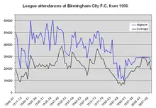 Smith took Birmingham straight back to the First Division, but a poor start to the 1981–82 season saw him replaced by Ron Saunders, who had just resigned from league champions Aston Villa. Saunders' team struggled to score goals and were relegated in 1984.[37] They bounced back up, but the last home game of the 1984–85 promotion season, against Leeds United, was marred by rioting, culminating in the death of a boy when a wall collapsed on him. This was on the same day as the Bradford City stadium fire, and the events at St Andrew's formed part of the remit of Mr Justice Popplewell's inquiry into safety at sports grounds.[38] The club lacked stability both on and off the field. Saunders quit after FA Cup defeat to non-League team Altrincham, staff were laid off, the training ground was sold, and by 1989 Birmingham were in the Third Division for the first time in their history.[39]