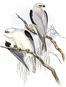 The black-shouldered kite was first described by English ornithologist John Latham in 1801, as Falco axillaris.[2] Its specific name is derived from the Latin axilla, meaning "armpit",[3] relating to the dark patches under the wings.[4] He reported the description came from a bird that had been kept for two months in the early colony.[5] The species description was based on one of four paintings by Australian painter Thomas Watling of a bird in the Sydney district in the 1790s.[6]