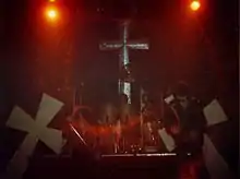 Under pressure from their record label, the band released their seventeenth studio album, Cross Purposes, on 8 February 1994, under the Black Sabbath name. The album received mixed reviews, with Blender giving the album two stars, calling Soundgarden's 1994 album Superunknown "a far better Sabbath album than this by-the-numbers potboiler".[123] AllMusic's Bradley Torreano called Cross Purposes "the first album since Born Again that actually sounds like a real Sabbath record".[124] The album just missed the Top 40 in the UK reaching number 41, and also reached 122 on the Billboard 200 in the U.S. Cross Purposes contained the song "Evil Eye", which was co-written by Van Halen guitarist Eddie Van Halen, although uncredited because of record label restrictions.[30] Touring in support of Cross Purposes began in February with Morbid Angel and Motörhead in the U.S. The band filmed a live performance at the Hammersmith Apollo on 13 April 1994, which was released on VHS accompanied by a CD, titled Cross Purposes Live. After the European tour with Cathedral and Godspeed in June 1994, drummer Bobby Rondinelli quit the band and was replaced by original Black Sabbath drummer Ward for five shows in South America.