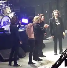 Osbourne's excessive substance abuse led to his firing in 1979. He was replaced by former Rainbow vocalist Ronnie James Dio. Sabbath recorded three albums with Dio, Heaven and Hell (1980), Mob Rules (1981) and the live album Live Evil (1982), with the last two featuring drummer Vinny Appice replacing Ward. Following Dio and Appice's departures, Butler and Iommi recorded Born Again (1983) with Deep Purple vocalist Ian Gillan and Ward returning on drums. Black Sabbath split in 1984, with Iommi assembling a new version of the band the following year. For the next twelve years, the band endured many personnel changes that included vocalists Glenn Hughes, Ray Gillen and Tony Martin, as well as several drummers and bassists. Martin, who replaced Gillen in 1987, was the second-longest serving vocalist after Osbourne and recorded three albums with Black Sabbath before his dismissal in 1991. That same year, Iommi rejoined with Butler, Dio and Appice to record Dehumanizer (1992). After two more studio albums with Martin, who returned to replace Dio in 1993, the band's original line-up reunited in 1997 and released a live album, Reunion, the following year; they continued to tour occasionally until 2005. Other than various back catalogue reissues and compilation albums, as well as the Mob Rules-era line-up reuniting as Heaven & Hell, there was no further activity under the Black Sabbath name until 2011 with the release of their final studio album and 19th overall, 13, in 2013, which features all of the original members except Ward. During their farewell tour, the band played their final concert in their home city of Birmingham on 4 February 2017.[3][4] Occasional partial reunions have happened since, most recently when Osbourne and Iommi performed together at the closing ceremony of the 2022 Commonwealth Games in Birmingham.[5]